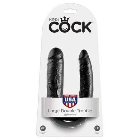 King Cock Double Trouble to realistyczne dildo z dwoma główkami, które jednocześnie penetrują pochwę i odbyt. Wersja Large jest największą z pozostałych, polecana paniom doświadczonym, które lubią większe rozmiary. Wykonane z wysokiej jakości winylu, wolnego od ftalanów, nie uczula i nie powoduje podrażnień. Dildo wiernie odzwierciedla rzeczywistość. Dokładnie odwzorowuje strukturę żył, kształt penisa, jego proporcje oraz dokładnie wyprofilowana główkę. Double Trouble oznacza podwójną przyjemność. Dildo posiada dwa penisy. Grubszy służy do stymulacji pochwy, natomiast smuklejszy penetruje odbyt. Gadżet dostarczy Ci niezapomnianych przeżyć ze zdwojoną siłą! Jednoczesna i głęboka stymulacja punktu G i wrażliwych ścianek anusa zaleje Cię falą niekończących się orgazmów!