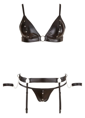 Całość wykonana jest z błyszczącego materiału typu wetlook, który przypomina lateks. Idealnie opina ciało, nadając mu ognistego charakteru. Biustonosz posiada regulowane ramiączka oraz przepiękne metalowe kółeczko między piersiami. Wzdłuż linii sutków zostały umieszczone zatrzaski, które oprócz funkcji praktycznej, pełnią także funkcję ozdobną. Oprócz biustonosza w zestawie znajdziesz także rewelacyjne, kuse majteczki z otworem w kroku. Całości dopełnia wąski pas do pończoch, który po bokach przechodzi metalowym łańcuszkiem w kajdanki. Łańcuszki zakończone są karabińczykami- dzięki temu można je swobodnie odczepić. Kreacja została zaprojektowana tak, aby podczas chwil uniesienia nie było konieczności zdejmowania jej. Wypróbuj w swojej sypialni i sprawdź, co możesz zdziałać z tym seksownym body!