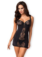 Nieco frywolna, seksowna koszulka wykonana z prześwitującej siateczki. Materiał cudownie przylega do ciała podkreślając wszystkie atuty sylwetki. Otwarte miseczki z piękną, koronkową wstawką o niezwykłym wzorze fantastycznie eksponują piersi. Lekkie usztywnienie pozwala na jeszcze lepsze podkreślenie biustu a regulowane ramiączka zapewniają możliwość idealnego dopasowania. Drobna kokardka i delikatna błyskotka w okolicach biustu dodają uroku. Do koszulki dołączono powabne, pasujące do całości stringi. Pikantny fason miseczek zawróci w głowie nie tylko Tobie!